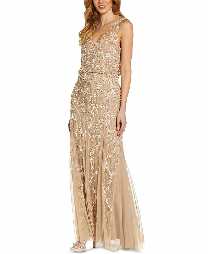 A romantic mix of beads and sequins sparkle throughout the sleeveless silhouette of this Adrianna Papell gown, designed with a blouson bodice and beautifully draped back.