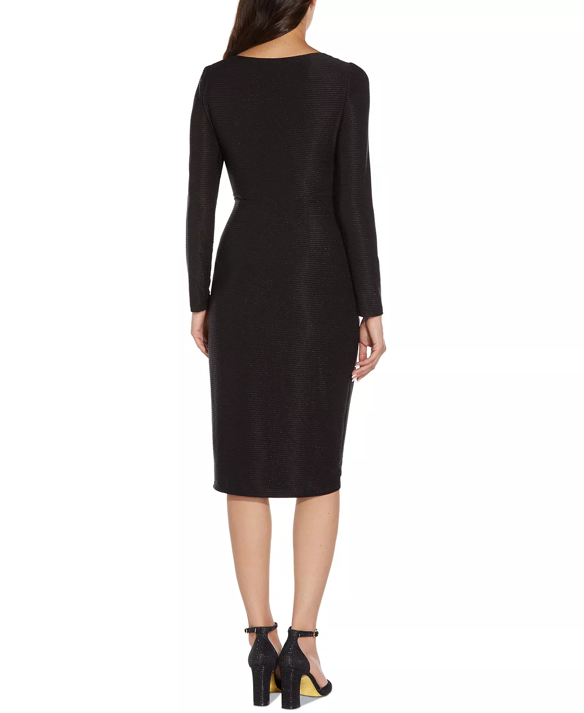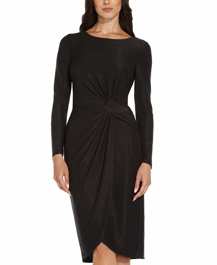 Sparkle the night away in style with Adrianna Papell’s sophisticated sheath dress, a sleek long-sleeve style glittering with a shimmering metallic and finished with a chic twist at the front.