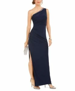 - Silver-tone embellishment at hem of neckline; draping/ruching at side of waist; slit at side hem for leg