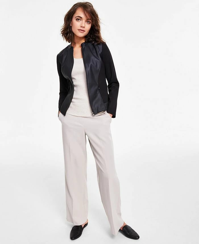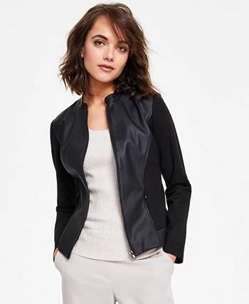A mixed-media design infuses modern appeal to Alfani’s band collar jacket, featuring faux-leather accents.