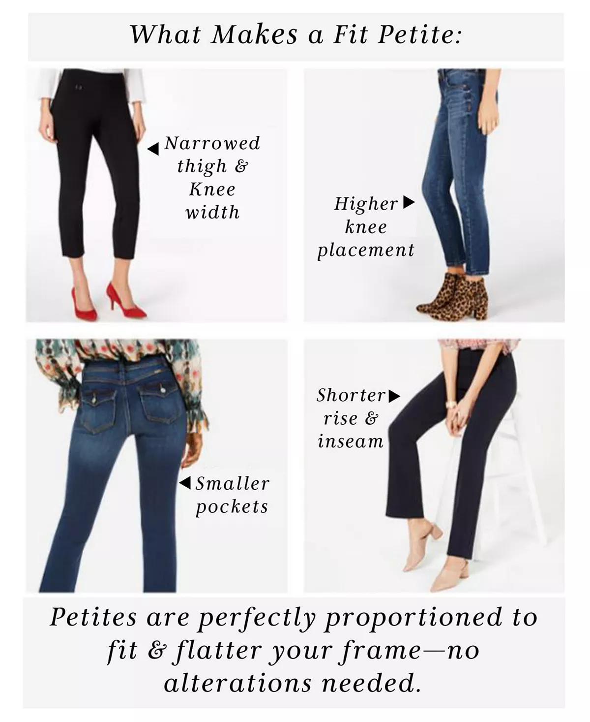 - Petite sizes designed to fit and flatter 5’4″ and under frame