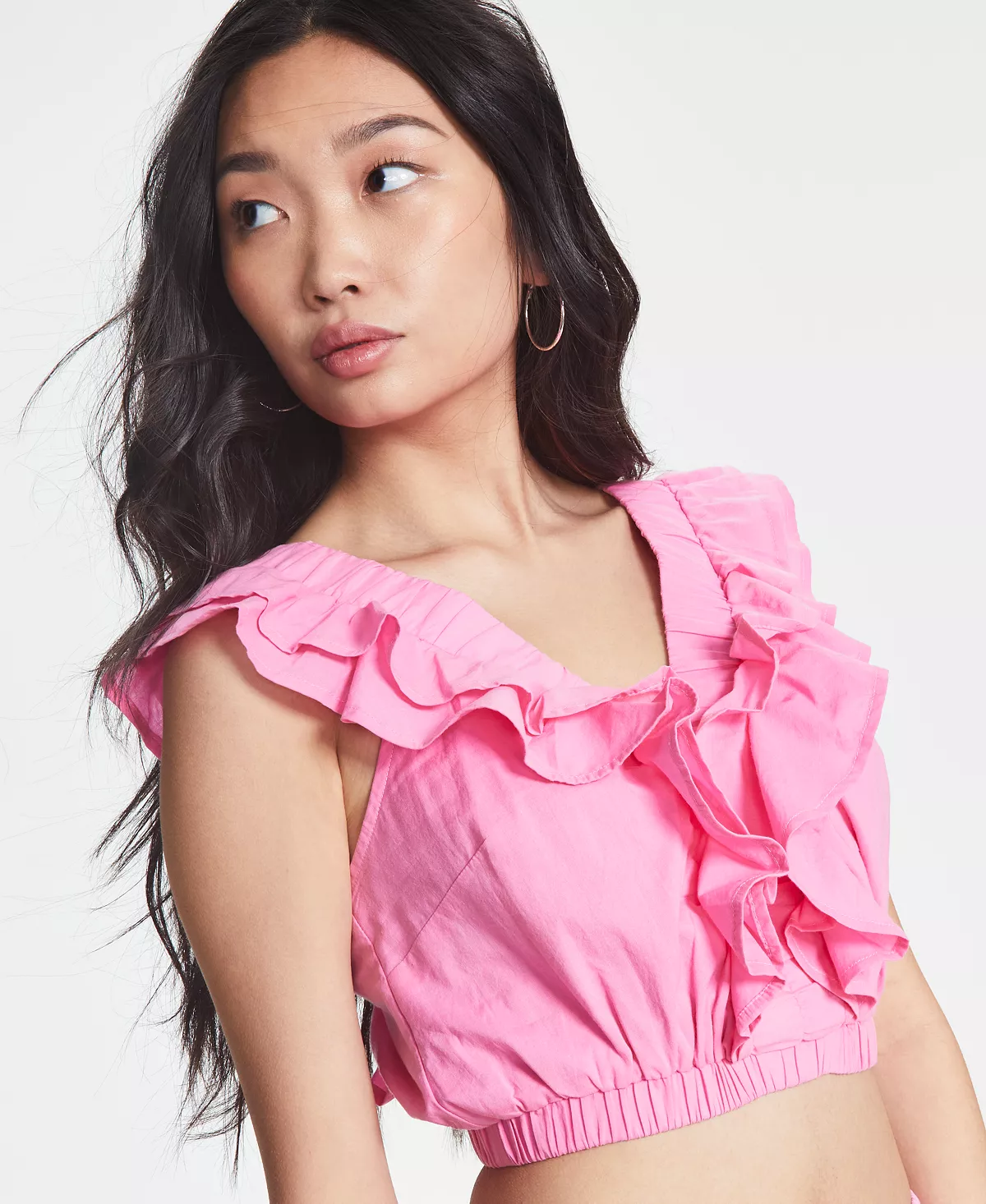 And Now This brings fierce style with this perfectly ruffled top that features a fitted waistline.