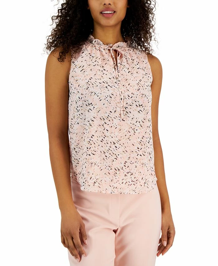 A ruffle-trim tie neckline and allover abstract print team up to make magic in this work-ready Anne Klein blouse.