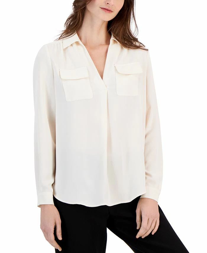 Simplify your style with a sleek popover shirt from Anne Klein. Flap pockets and a shirttail hem keep the overall look classic and elegant.