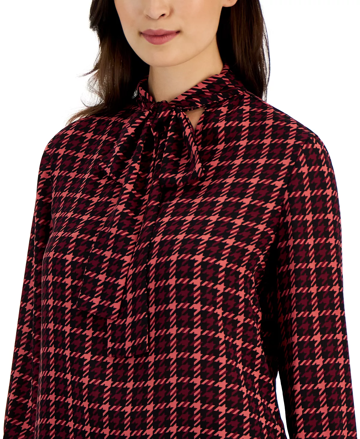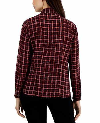 An elegant tie neckline amps up the sophistication on Anne Klein’s long-sleeve top, a stylish houndstooth print design that pairs perfectly with your go-to suit.