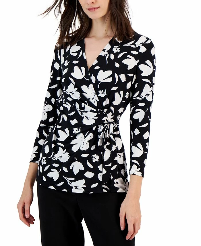 Chic in a bold and sophisticated print, this Anne Klein top features a flattering faux-wrap design.