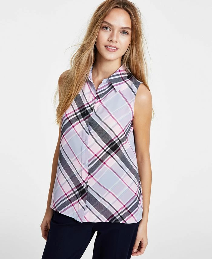 Dynamic on the diagonal, the oversized plaid of this Bar III collared button-up top adds striking style to workday wear.