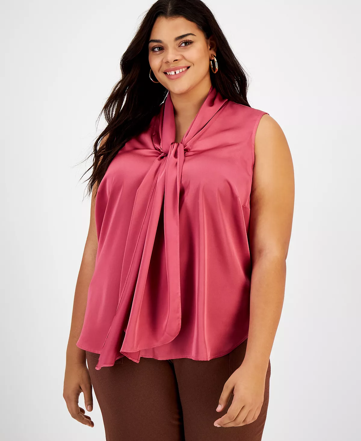 Be boardroom-ready in this plus size sleeveless blouse by Bar III that is elevated with bow-tie detail, lending a polished edge to a versatile look.