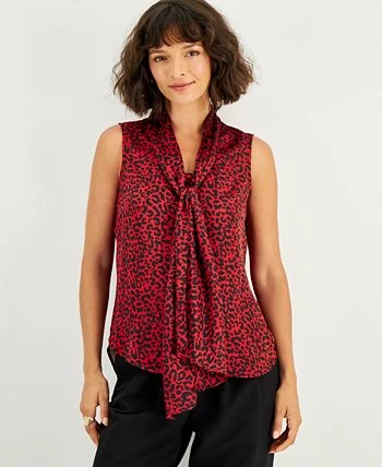 Finished with a bow or flowing free, neckline tie ends accent the animal-print style and business-friendly look of this Bar III blouse.