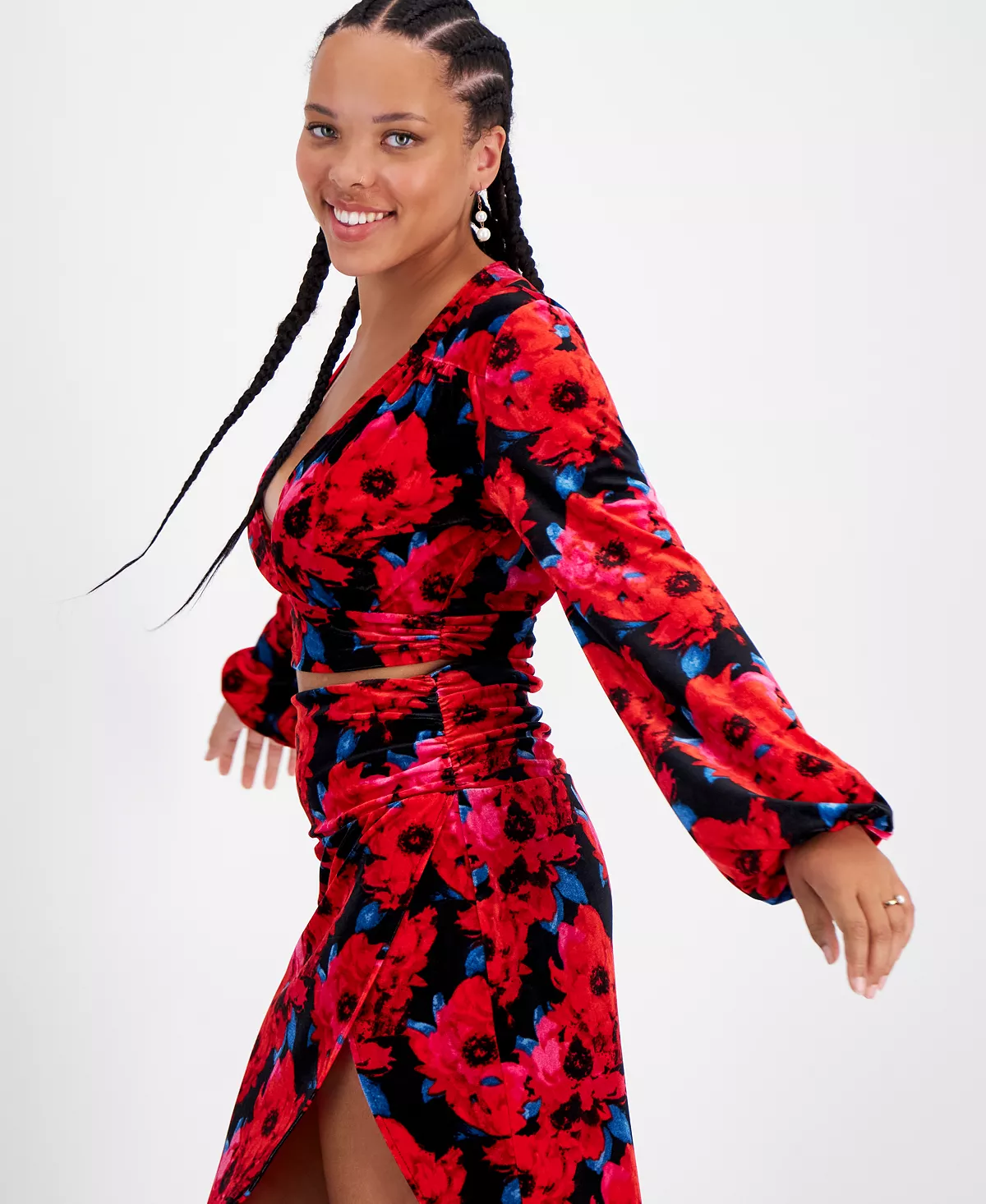 Bar III elevates your wardrobe with this floral-print cropped velvet top.
