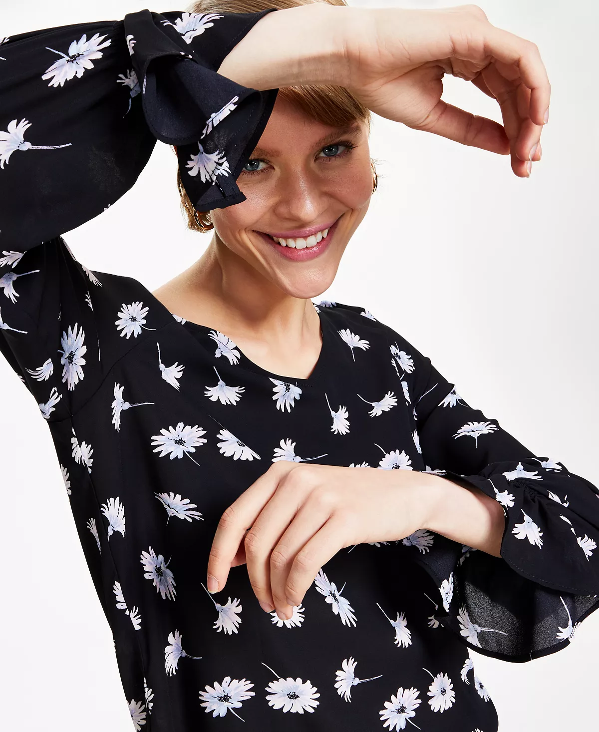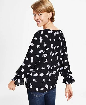 Softly flounced cuffs lend a little beauty to this polished top from Bar III, a stylish pick designed with a blossoming floral print.