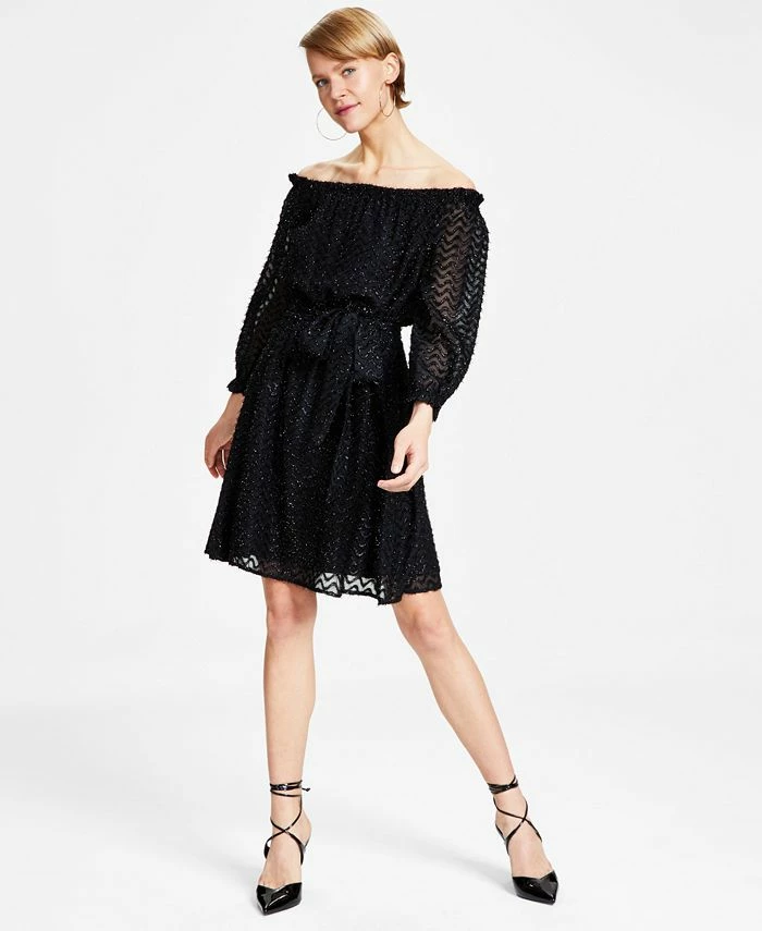 Swirls of sparkly eyelash detail lend endless drama and depth to this chic off-the-shoulder dress from Bar III. A smocked waistline completes the look.