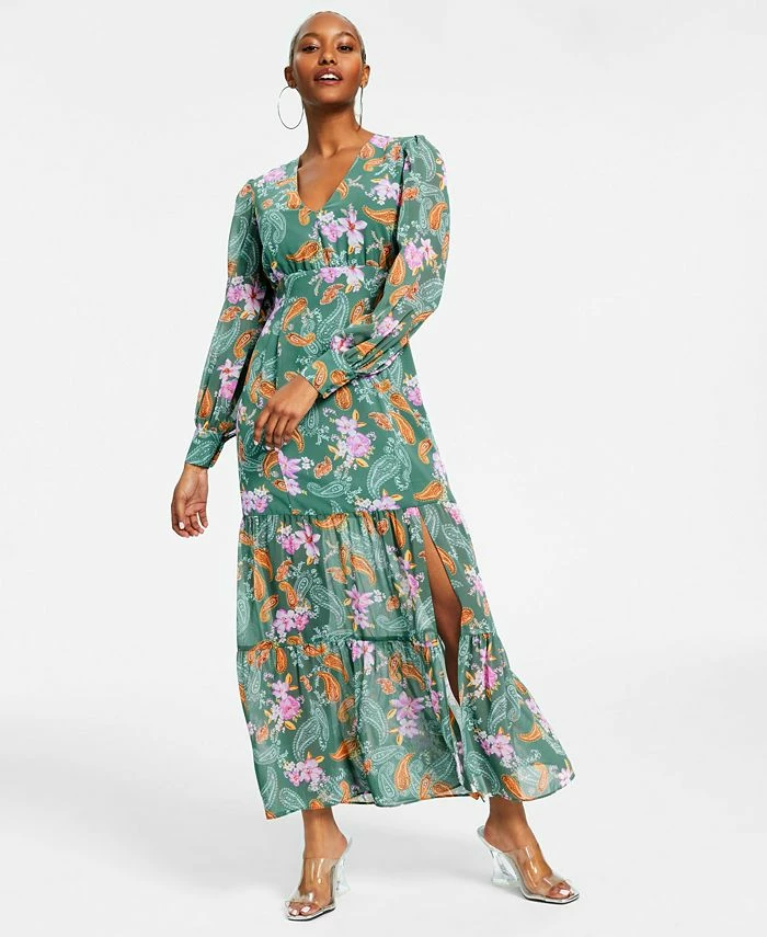 Flowers and a swirling paisley print bring boho-chic vibes to Bar III’s breezy maxi dress, framed by long puff-shoulder sleeves for a style that works all year long.