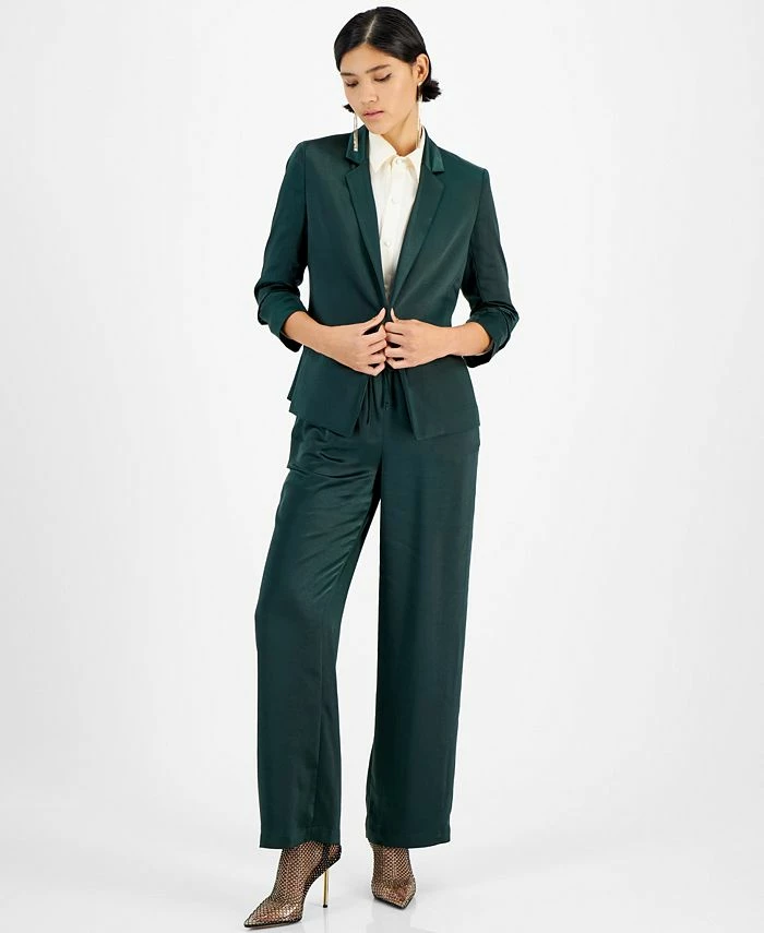 Washed satin dresses up the laid-back details (like pleated sleeves and a drawstring waist) of Bar III’s jacket and pull-on pants to add professional polish to your look.