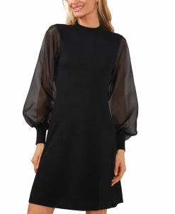 CeCe utilizes mixed-media design to perfection in this striking, combed-cotton sweater dress, the showcase of the piece is the organza sleeve, a statement style which beautifully frames a classic fit and flare silhouette.