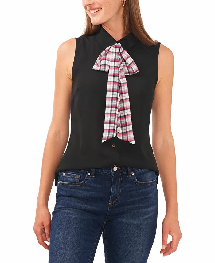 A gorgeous plaid bow lends endless charm to this sleeveless blouse from CeCe, complete with a collar for polish.