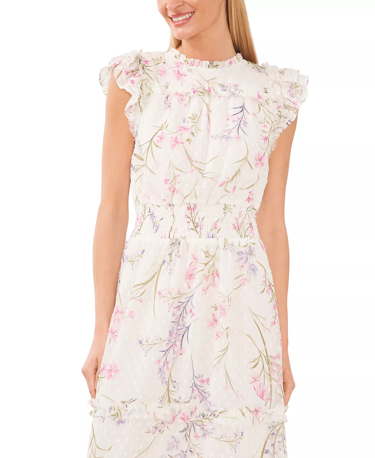 Look like a Spring day in CeCe’s sweet floral print dress, a flowy midi silhouette accented with frothy ruffles and a flattering smocked waistband.