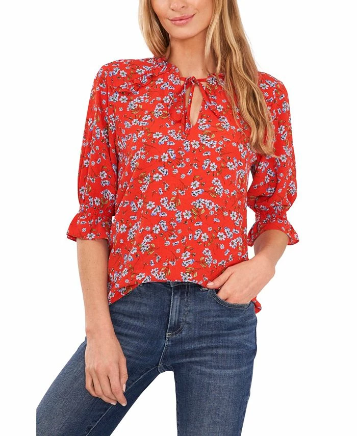 Blooming florals and ruffles aplenty lend a charmingly pretty look to this V-neck blouse by CeCe, finished with tie detailing at the neck, it’s the perfect addition to a chic casualwear collection.