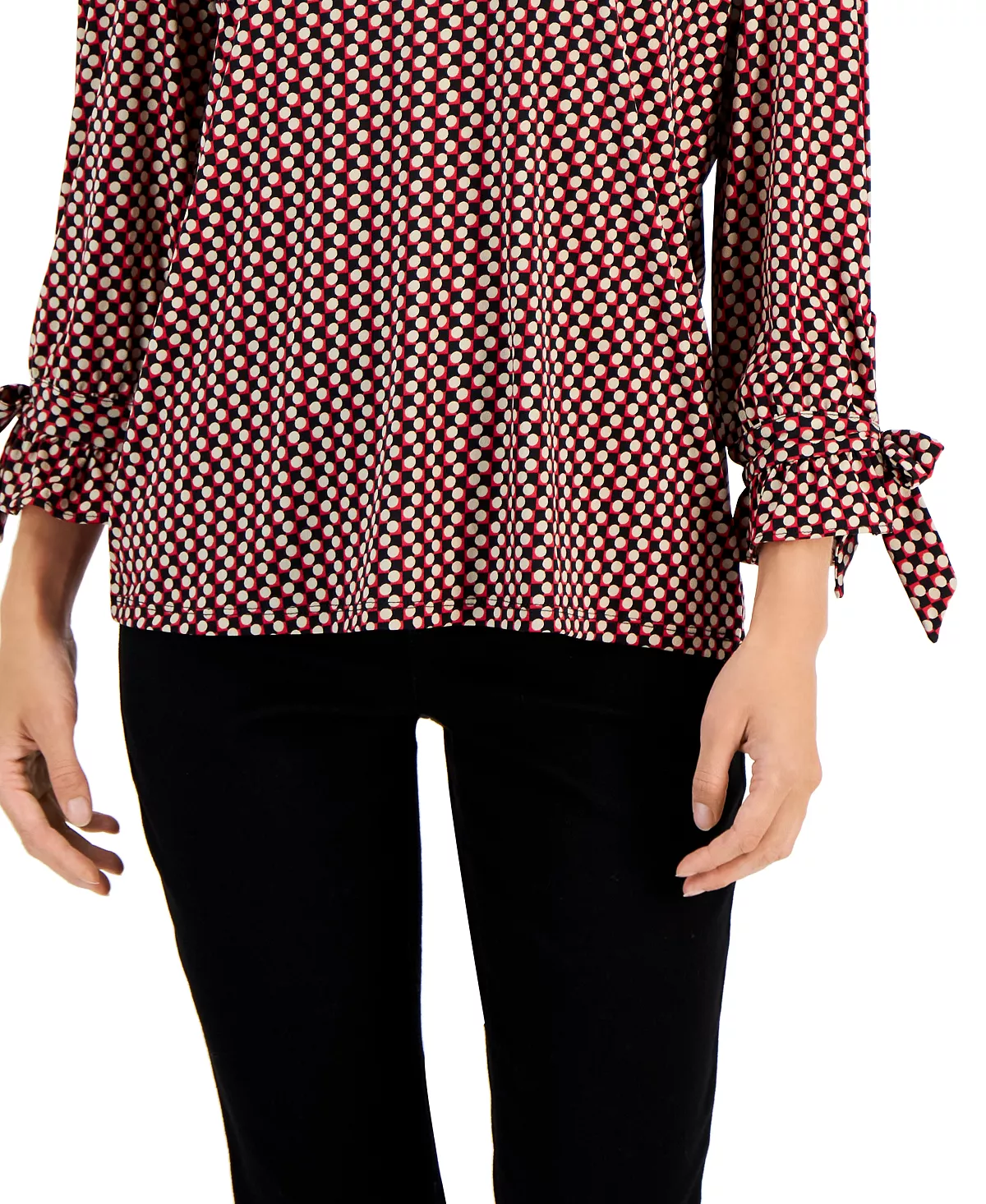 Charter Club Dresses up this geo-print V-neck design by adding elasticated sleeves with ruffle cuffs and bows.