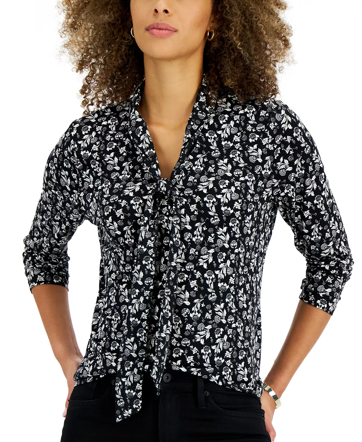 A wardrobe favorite, this floral print blouse by Charter Club exudes effortless style with the addition of a self-tie at the neckline.