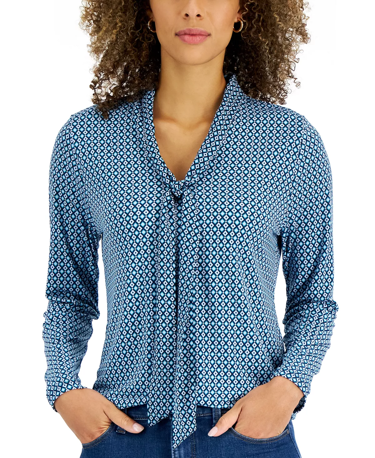 A subtle geometric printed pattern and a tie at the front compliment this blouse by Charter Club.