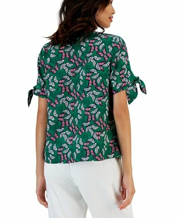 Flowy ties at the sleeves finish the crisp printed linen style of this split-neck top from Charter Club.