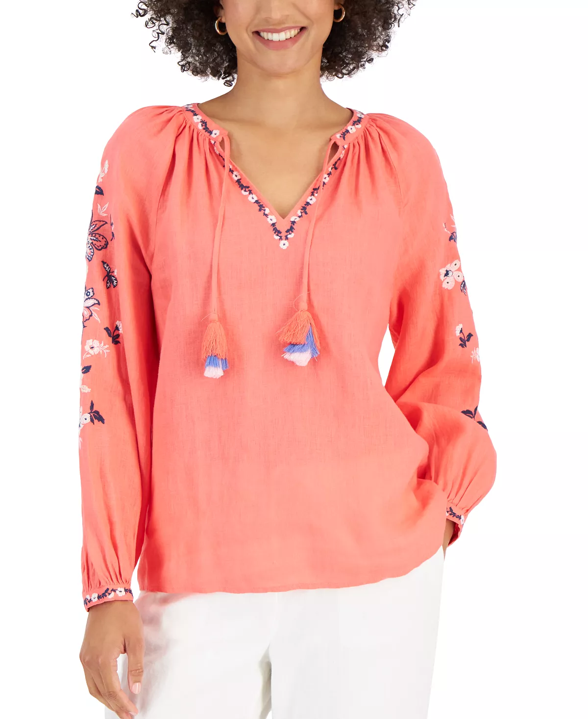 A vibrant update on boho chic, this Charter Club peasant top is in woven linen with floral embroidery in fresh colors.