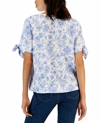 Classic linen is printed with floral flair and finished with flowy ties at the sleeves of Charter Club’s split-neck top.
