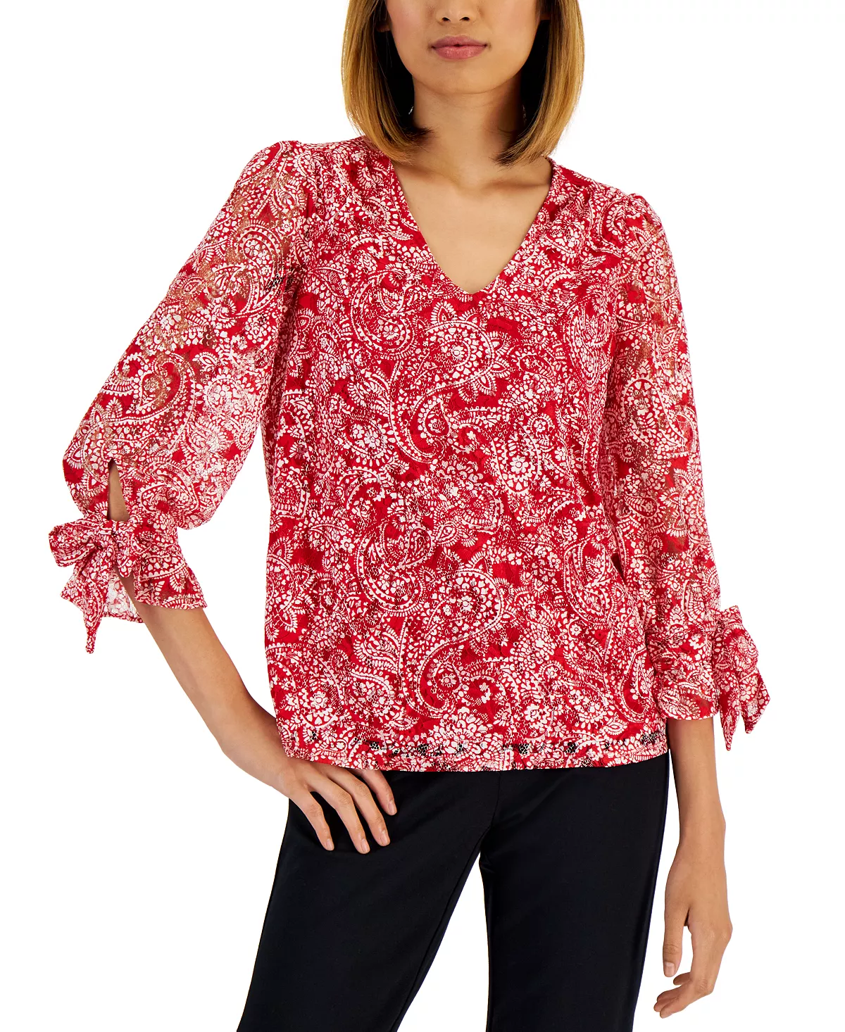 With sheer sleeves ended in tie cuffs, this paisley-covered top from Charter Club is sure to be your new fave.