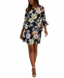 Flirty florals and a chic chiffon finish adorns this beautiful sheath dress by Connected, bell sleeves frame this piece and cascade into ravishing ruffles for an overall look that is sure to turn heads.