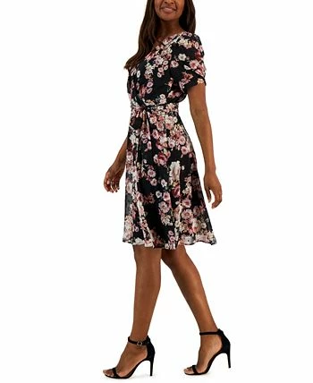 Flourishing florals combine with a sweet Swiss-dot design in this sheath dress by Connected, finished with a form-flattering belted waist, this dress is framed with a twisted sleeve for an overall look that will dazzle the crowd.