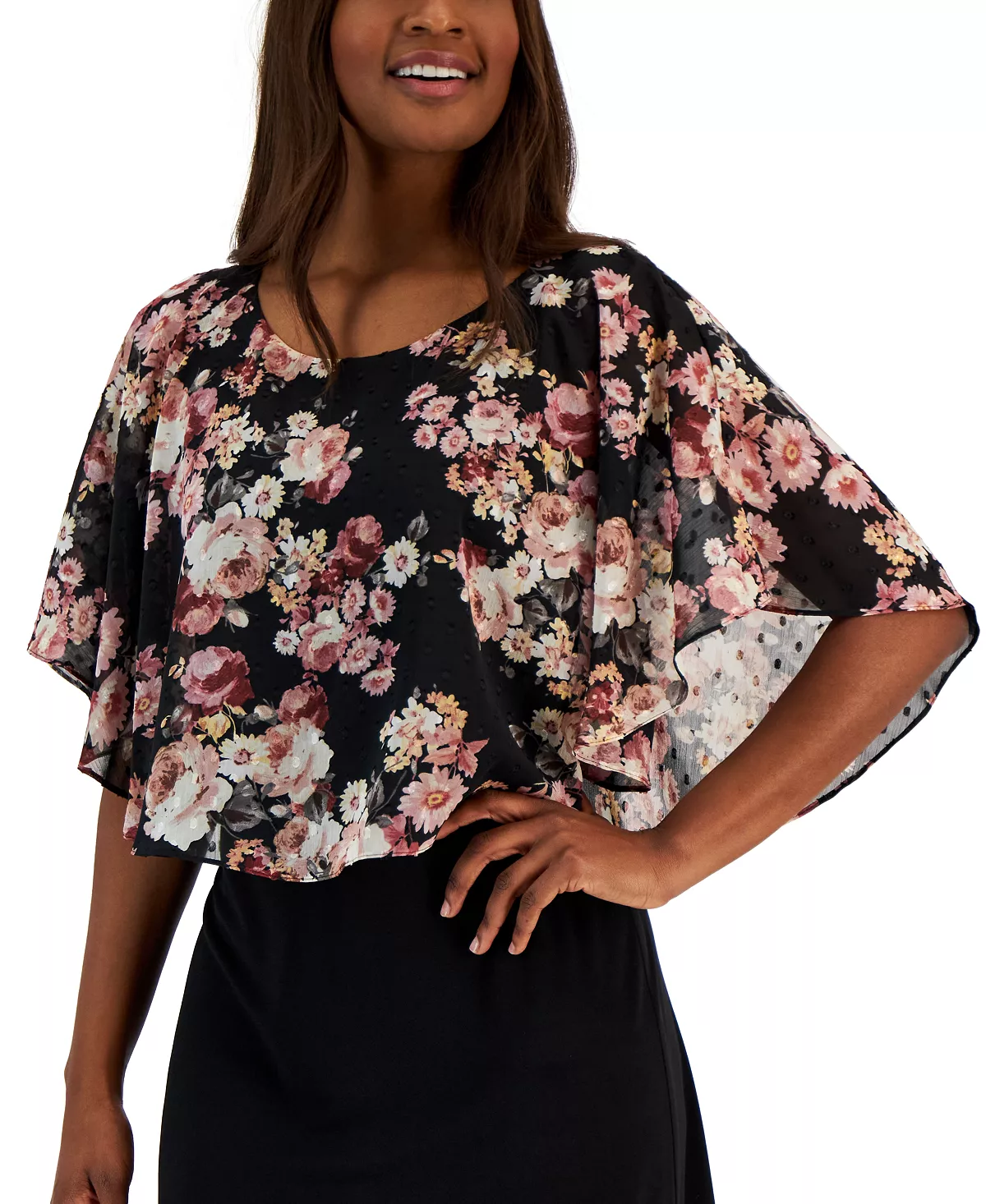 A floral-adorned cape overlay brings this sheath dress by Connected to life, the floral layer that is also finished in a Swiss-dot texture, flawlessly drapes over the tailored bodice, creating a look that will be sure to turn heads at your neck cocktail party.