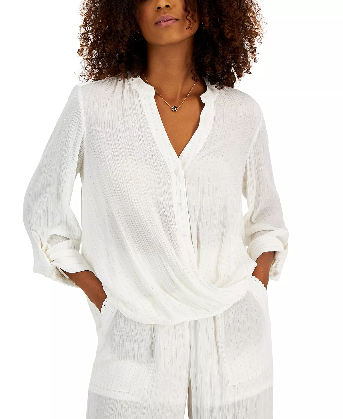A stand-out twist detail at the front waist brings a dose of feminine flair to this button-down blouse from INC International Concepts.