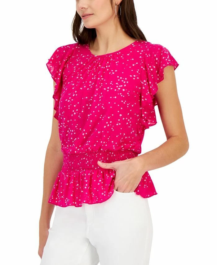 A soft statement in printed ditsy-dot knit, this INC International Concepts top combines cascading flutter sleeves with a smocked waistline and peplum hem.