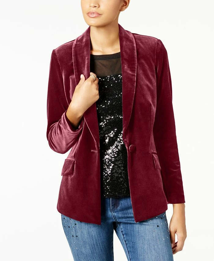 Add a rich, elegant piece that’s fit for any occasion with this chic velvet blazer from INC International Concepts, designed with a shawl collar and flap pockets.