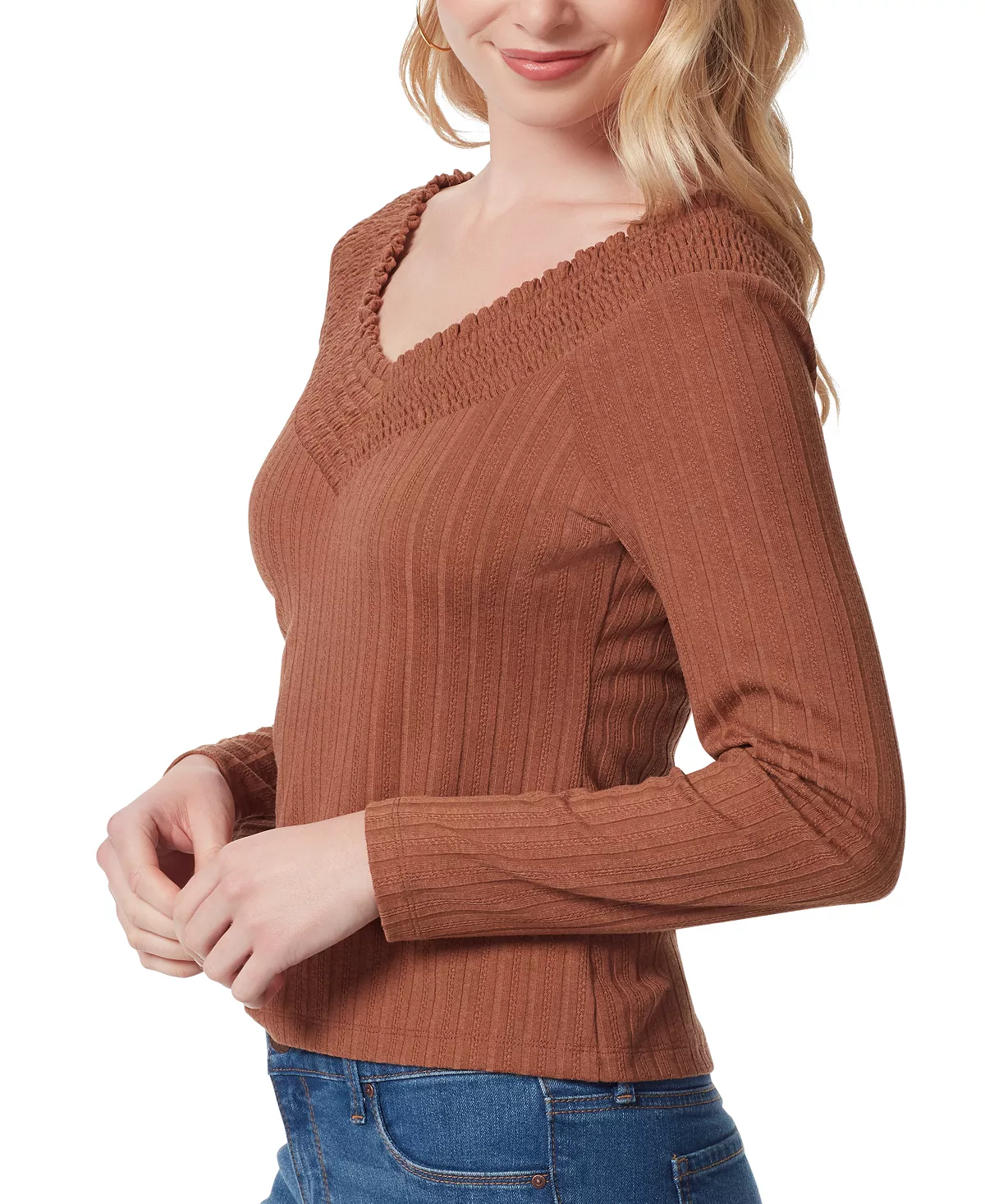 Jessica Simpson updates the classic long sleeve with a chic ribbed design and charming smocked panel at the neckline.