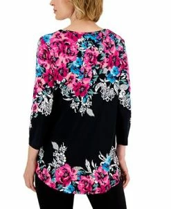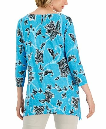 A bold print highlights jacquard details, bringing a fresh look to JM Collection’s easy swing top.