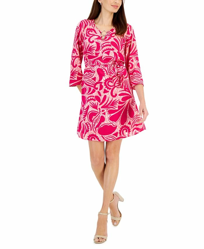 Effortless and vibrant, this JM Collection dress features a bold print and metallic rings at the neckline.