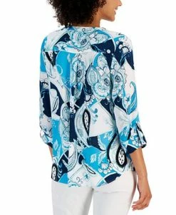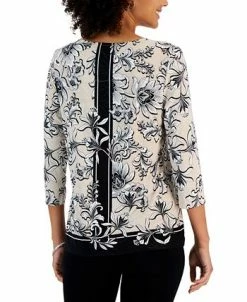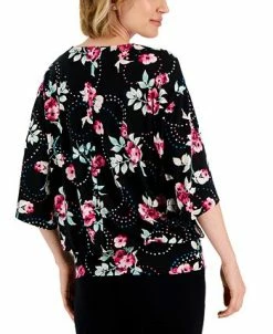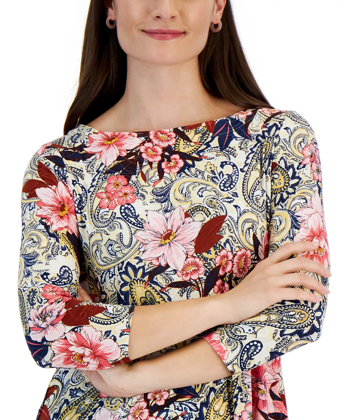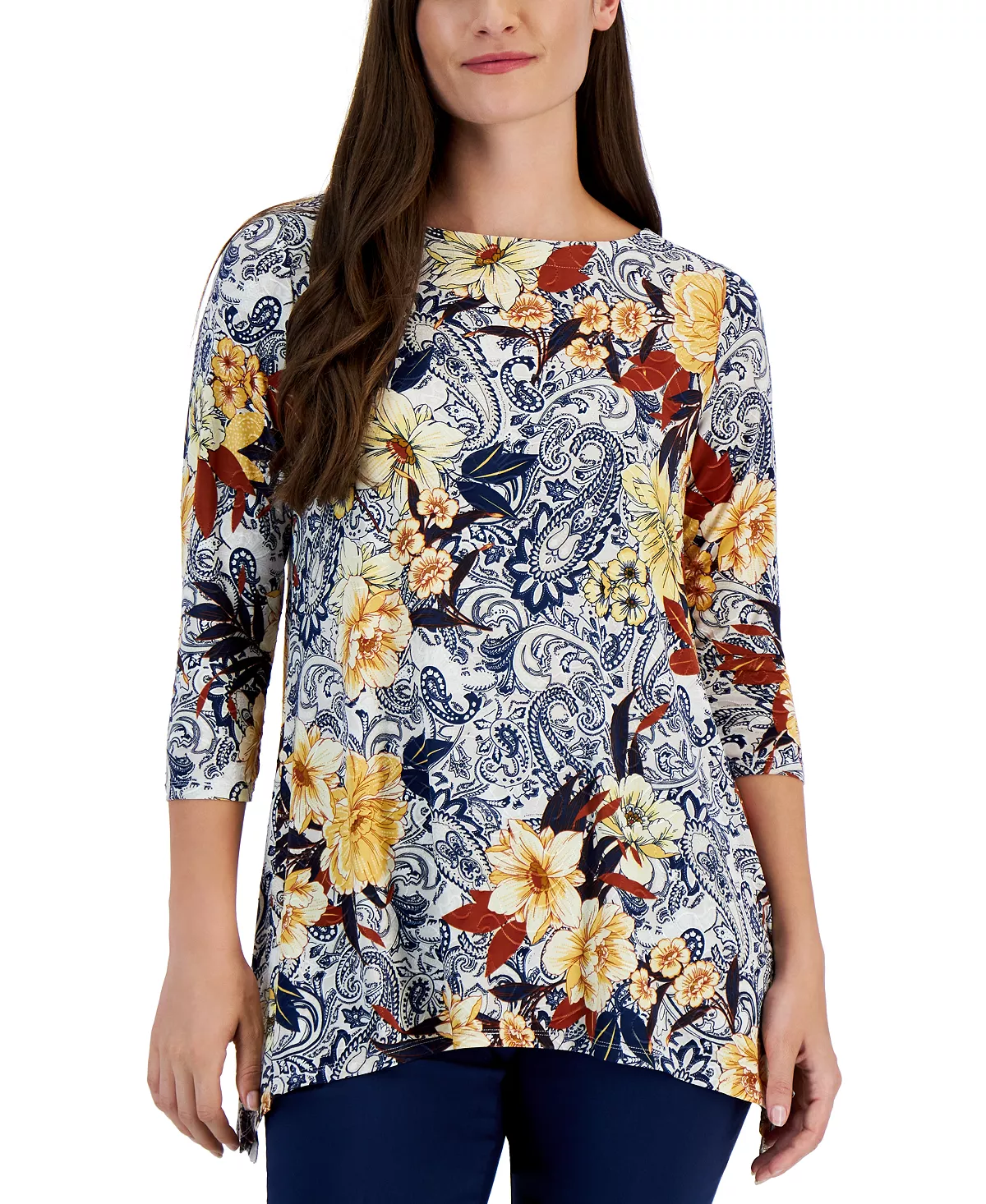 A flowing asymmetrical hem and allover florals come together to make magic in this 3/4-sleeve top from JM Collection.