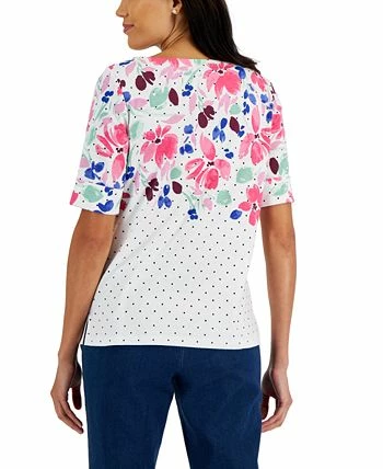 Flourishing florals cascade down into a sweet dot-print in this classically designed boatneck top by Karen Scott.