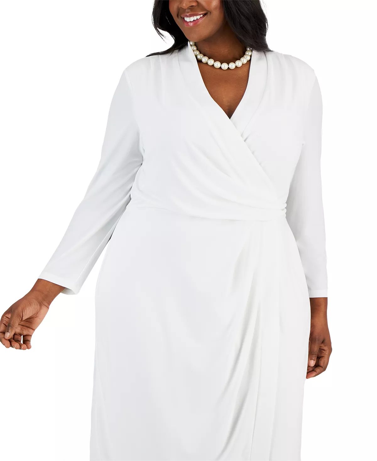 Colorblocked details and a subtle faux-wrap front pair with soft and stretchy jersey fabric on this flattering sheath dress from Kasper.