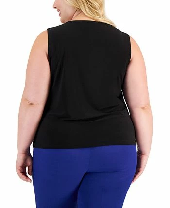 Kasper’s plus size career top features a stylishly twisted neckline with sleek faux-leather detail.