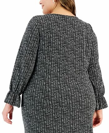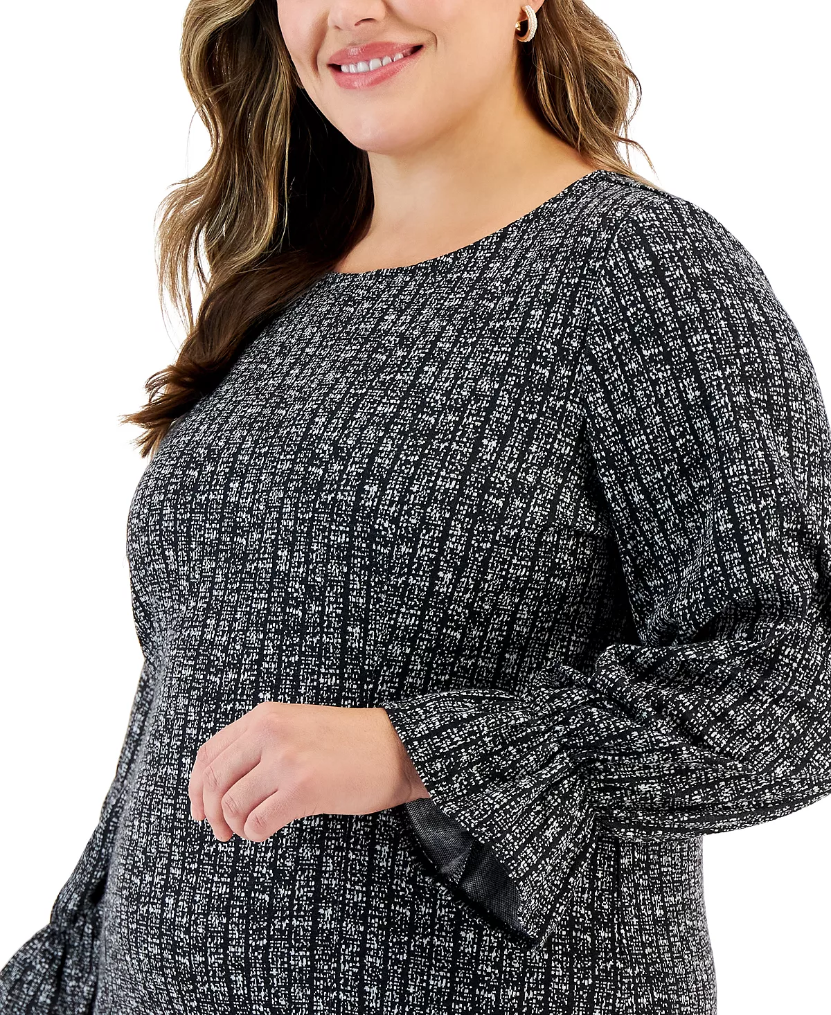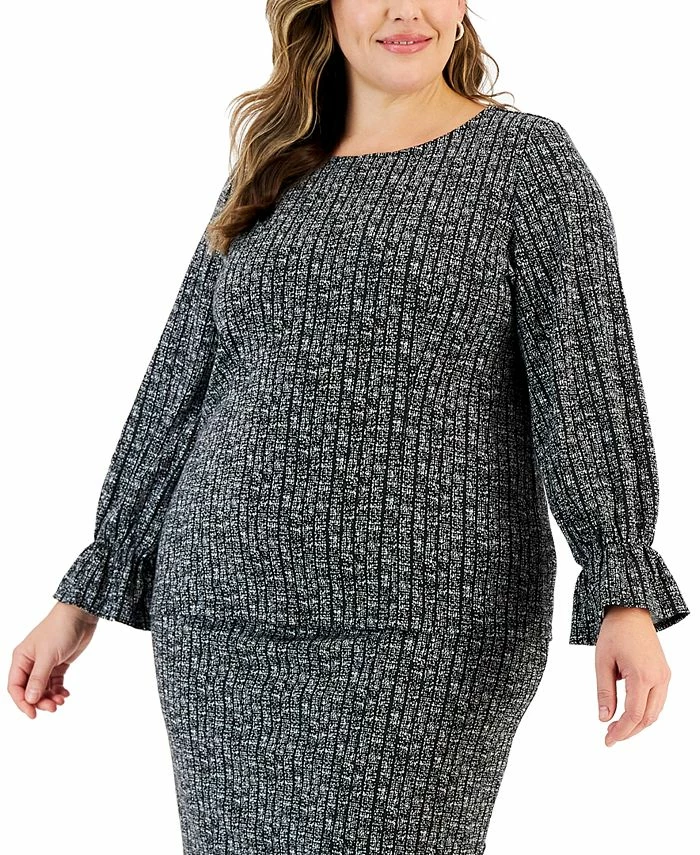 Kasper combines coverage with sleek and sophisticated design; this plus size blouse features a stylish flared-cuff sleeve and is finished in a perfectly polished print.