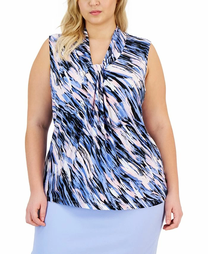 A twisted design updates a classic V-neck on this beautifully printed plus size top from Kasper. A stylish pick that looks great alone or under a blazer.