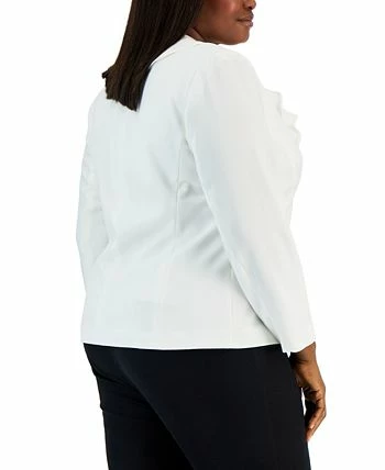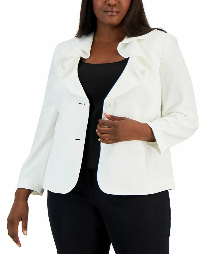 Kasper brings this elegant plus size two-button blazer, finished with a feminine ruffled neckline.