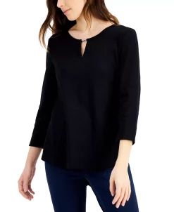Karen Scott Women’s Cotton Split-Neck Hardware Top, Created For Macy’s