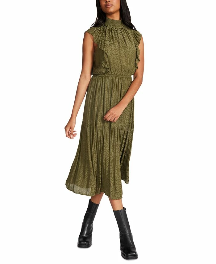 The Anna dress from BB Dakota by Steve Madden is an effortless, tiered maxi dress. Fashioned in a fierce animal jacquard satin, Anna has a mock-neck and a button-closure