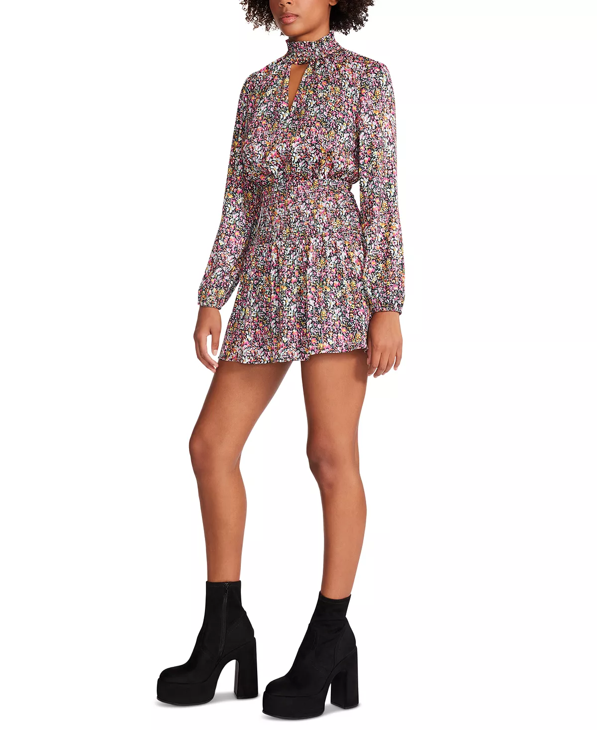 Steve Madden’s Natalie style is a fun, floral satin mini dress with smocking at the mock neck and waist, plus keyholes at the front and back.