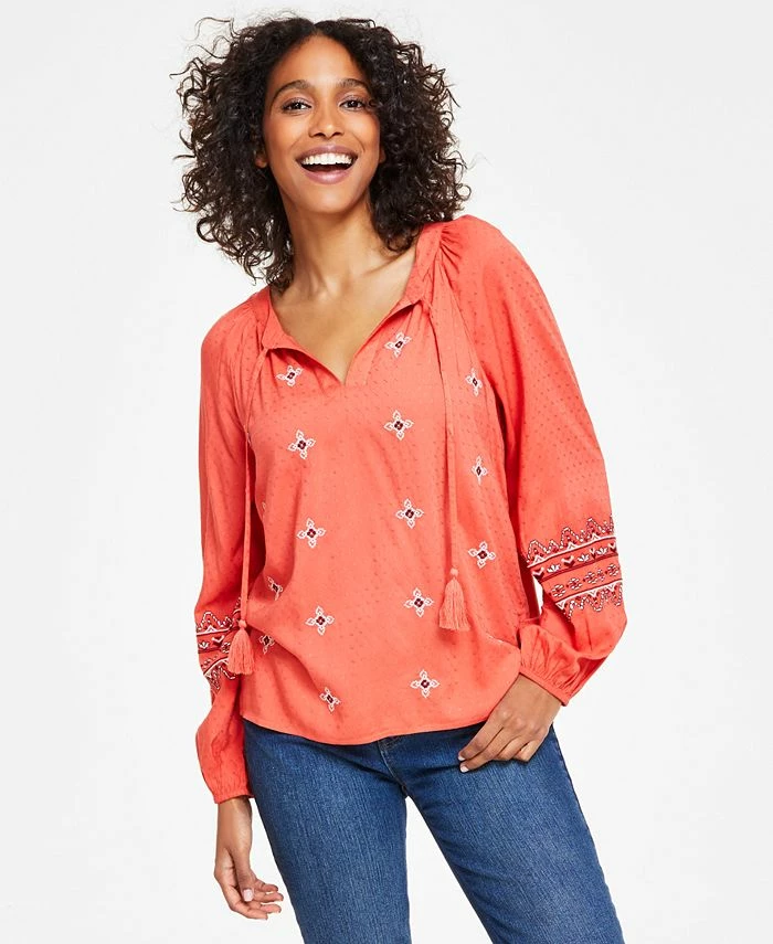 Stock up on classic looks with this women’s drapey embroidery top from Style & Co, a versatile essential for any chic closet.
