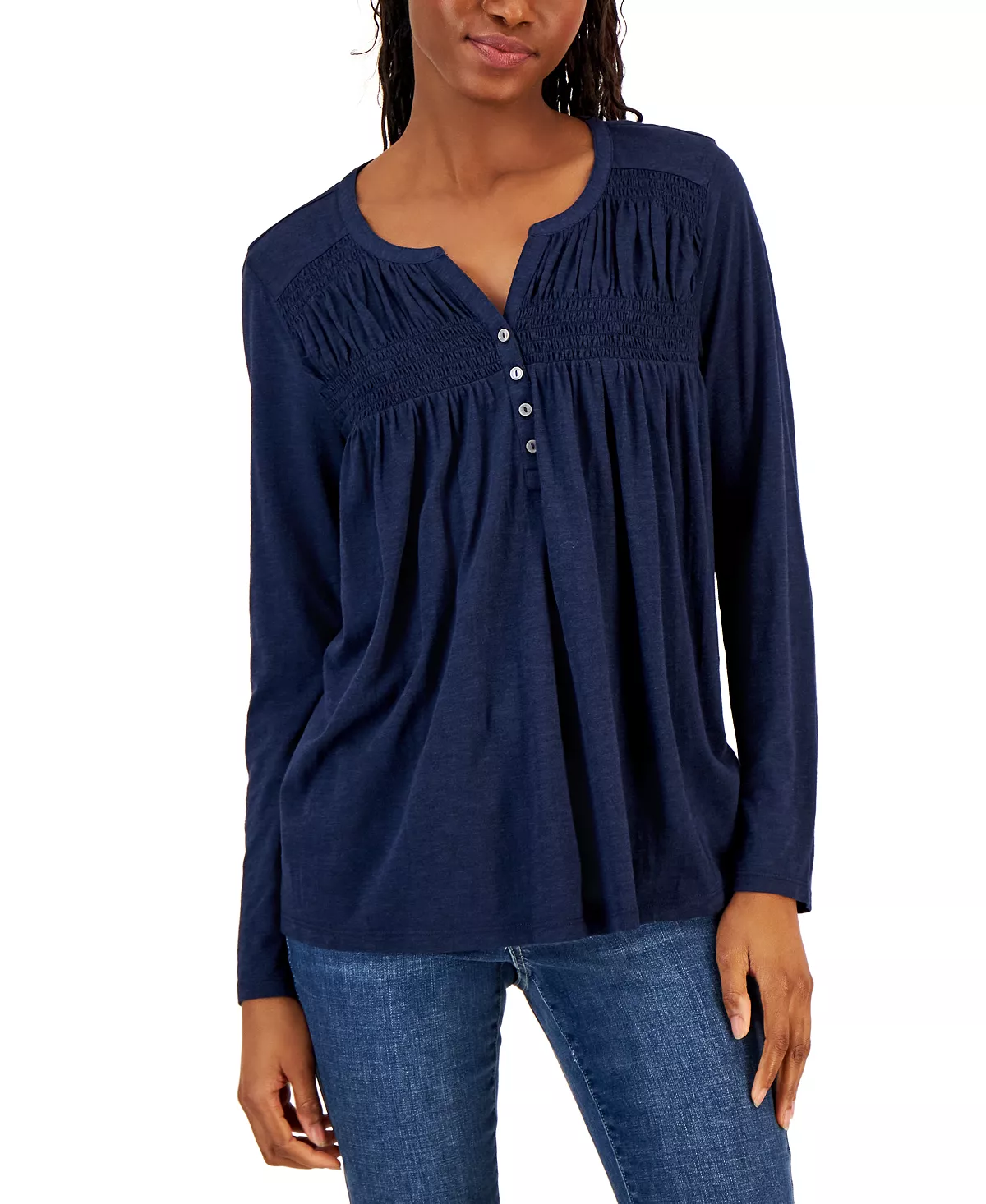 Delightfully delicate, this smocked-yoke top from Style & Co adds a hint of sophisticated style to your wardrobe.